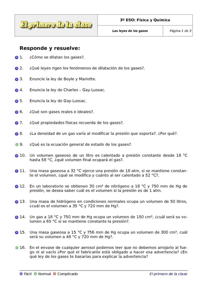 Los ejercicios de leyes de los gases 3º ESO ayudarán a los estudiantes a entender cómo funcionan los gases. Cubrirán temas como la presión, el volumen y la temperatura, y cómo estos afectan a los gases. Los ejercicios también enseñarán a los estudiantes cómo calcular la densidad de un gas y cómo los gases se comportan en una reacción química.