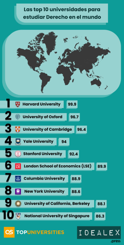 La Universidad de Harvard es la mejor universidad de derecho del mundo, según el Índice de Calidad de Educación Universitaria 2019 de Times Higher Education. La Universidad de Oxford ocupa el segundo lugar, seguida por la Universidad de Cambridge en el tercer lugar.
